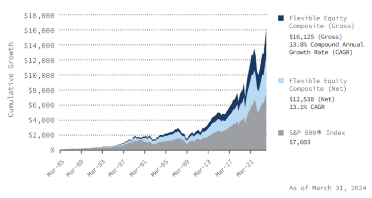 This approach has served clients well. If a client had invested $10,000 into Flexible Equity when it launched 40 years ago, it would be worth almost $1.3 million today, compared with about 616,000 for the S&P 500.